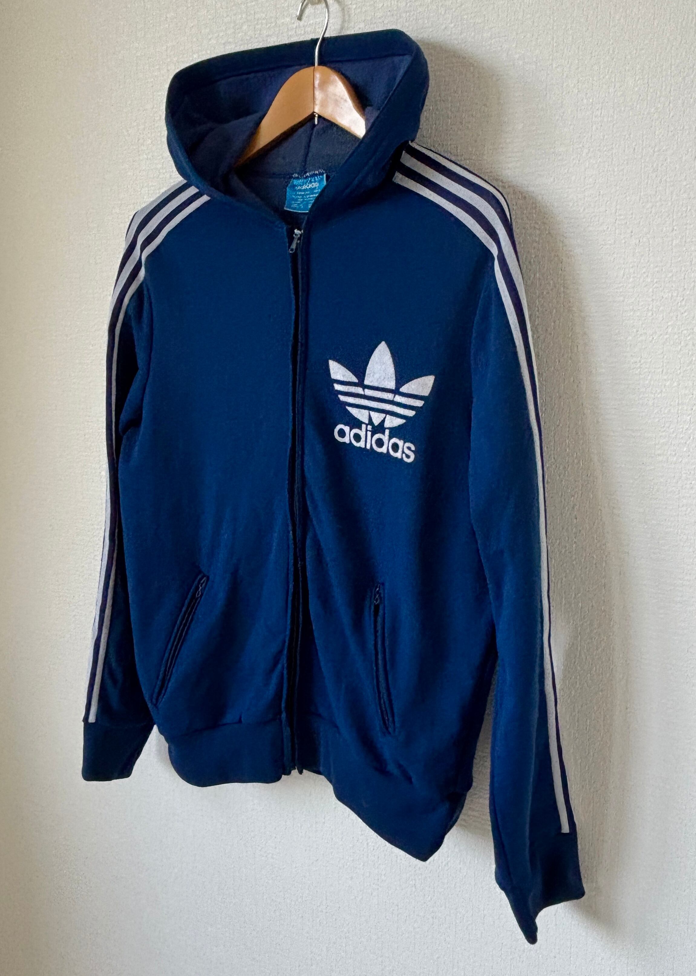 1972年から1995年までアディダスの正式ロゴとして使用されていた、トレフォイルロゴのパーカー。