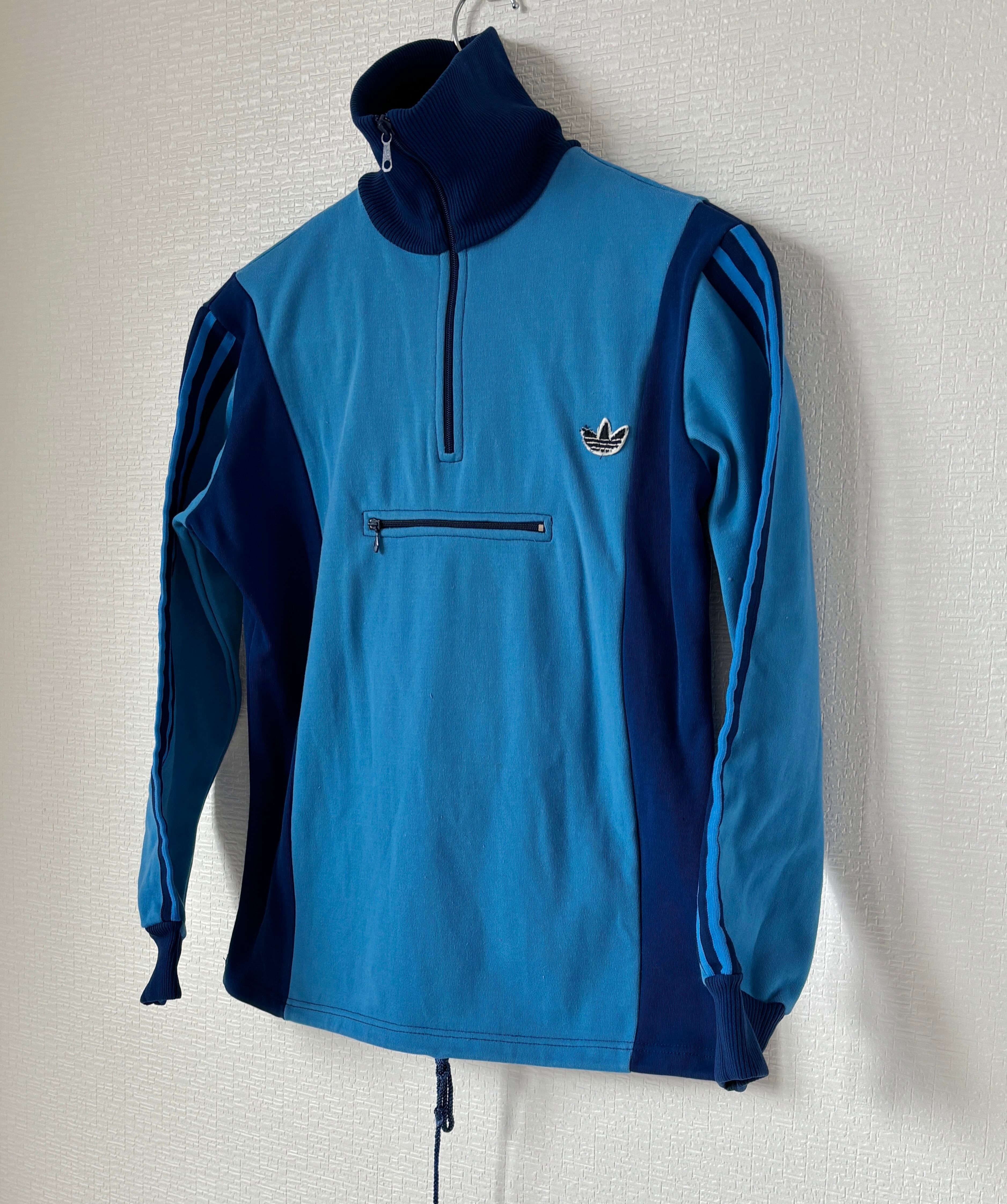 鮮やかなサックス×ブルーの 60〜70年代、ユーゴスラビア製のアディダスハーフジップジャージです。ジップもスムーズに稼働します