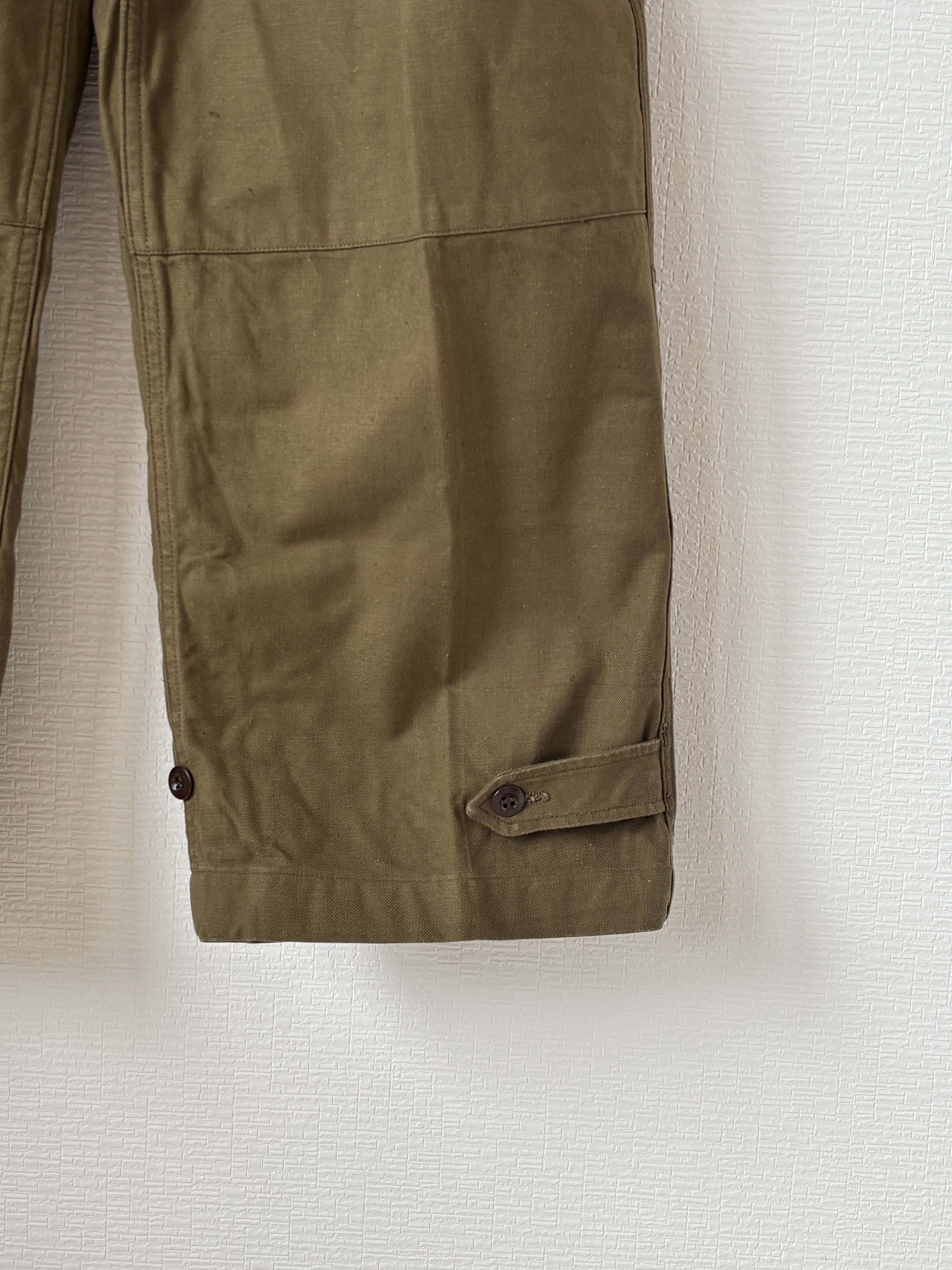 シルエットは太めのストレートで、両サイドには大きなフラップポケット、フラップを留めるボタン、裾のベルトなど、フレンチミリタリーの縫製の良さをこれでもかと感じることができると思います。