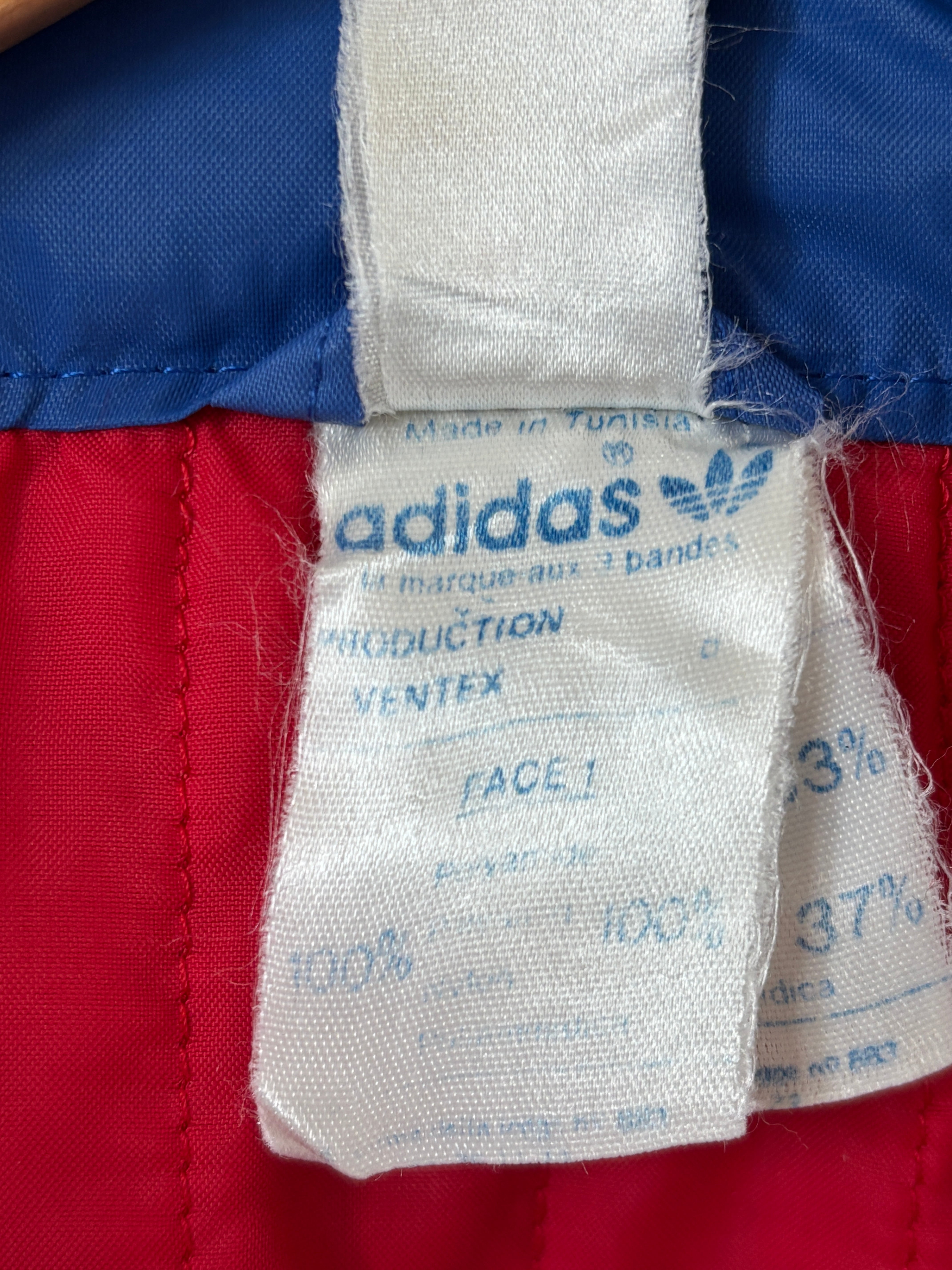 1972年から1995年までアディダスの正式ロゴとして使用されていたトレフォイルロゴの付いたナイロンジャケット。Ventex製です。