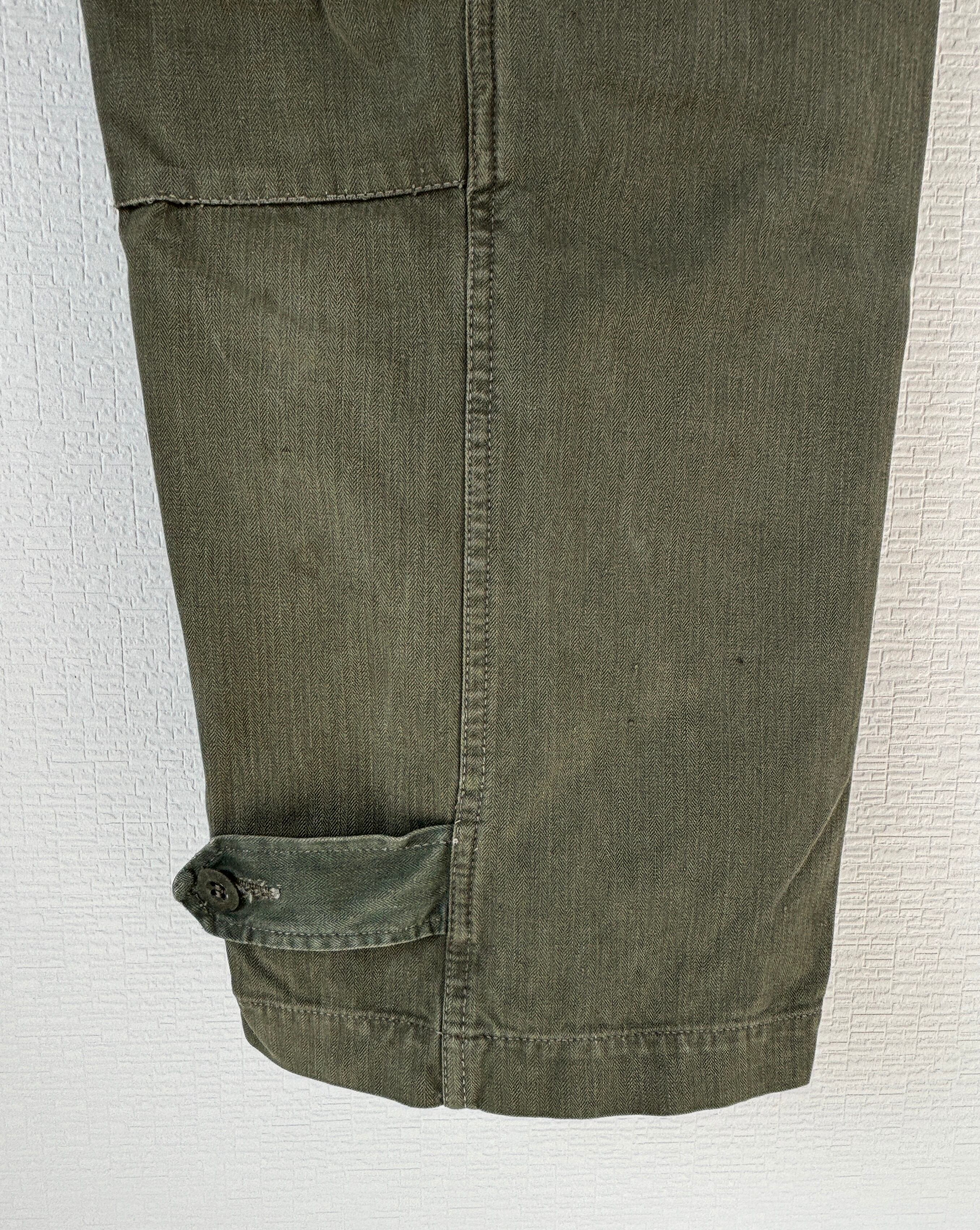 前期に比べるとやや軽い生地感ですが、しっかりとした印象です。生地にはヘリンボーンを使用。両サイドに大きなフラップポケットが付いていて、シルエットは少しテーパードしており、前期に比べるとすっきりしています。フレンチミリタリーの縫製の良さをこれでもかと感じることができると思います。