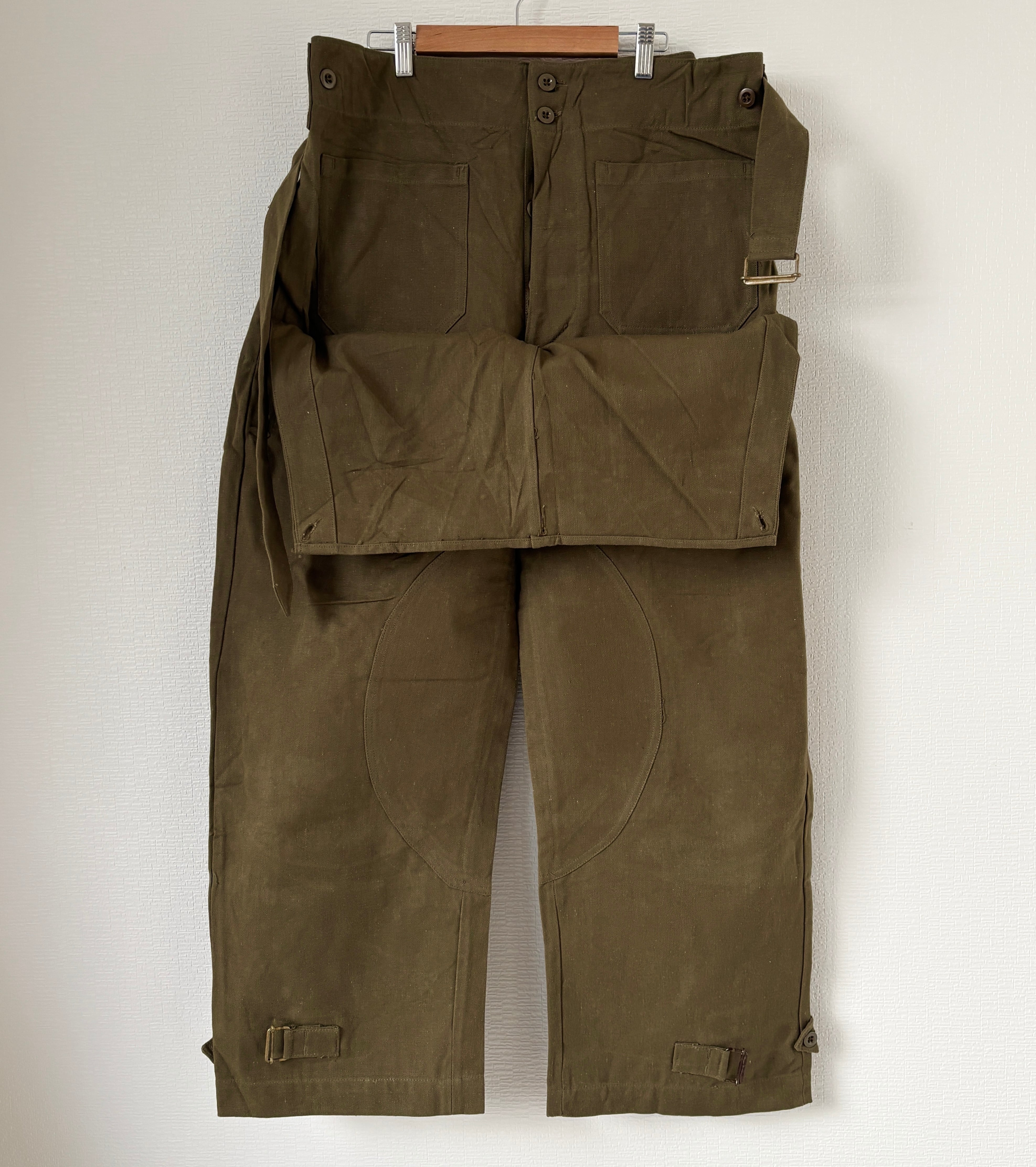 モーターサイクルパンツは大まかにM-35タイプの前期型と、M-38タイプの後期型に分類されますが、こちらは前当てありの希少な後期型です。