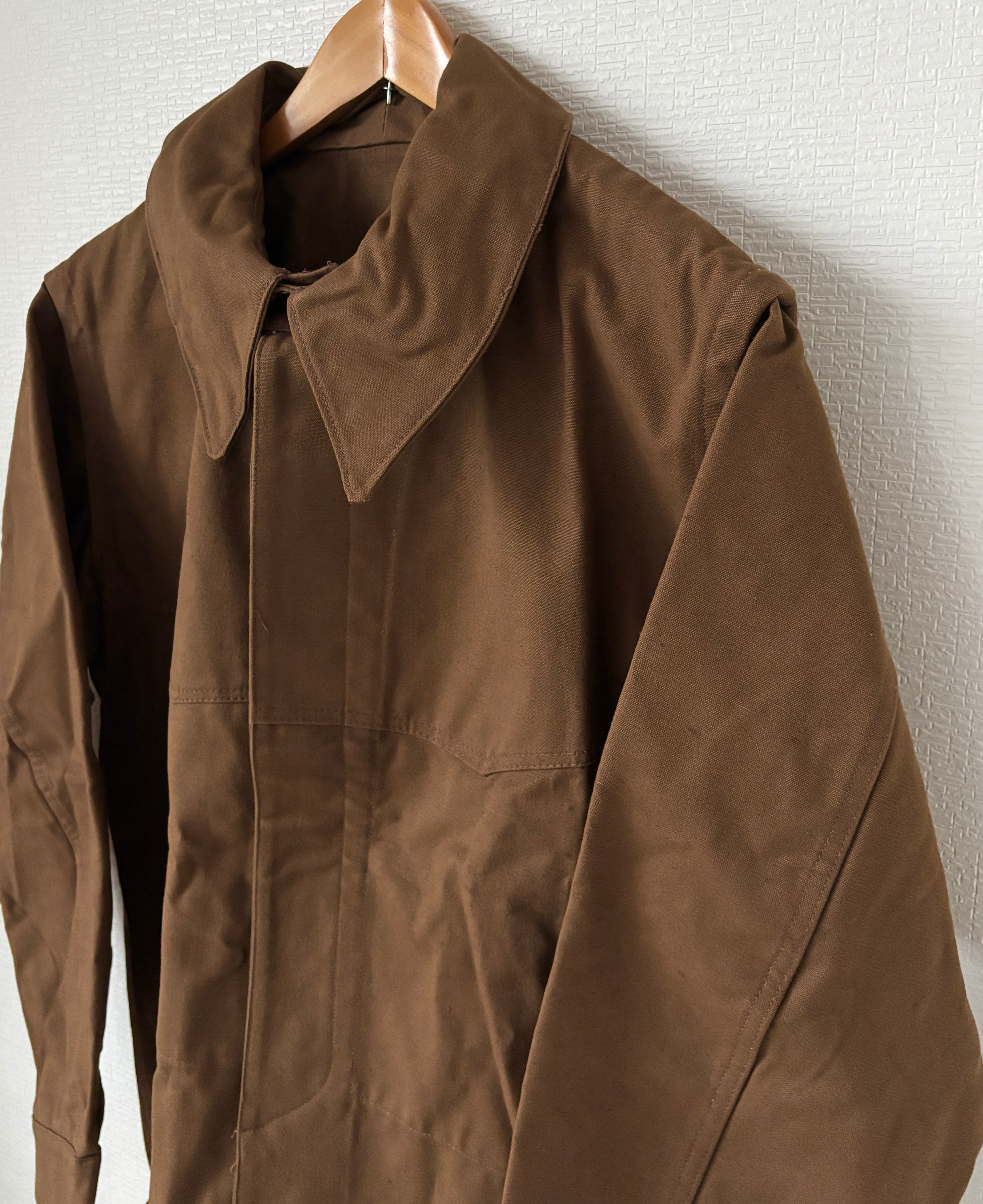 カラーは落ち着いたブラウンで、生地はダック地のようながっしりとした質感です。 襟はスタンダードな形でやや大きめのレギュラーカラーなっていて、襟の裏にチンストラップが付いています。