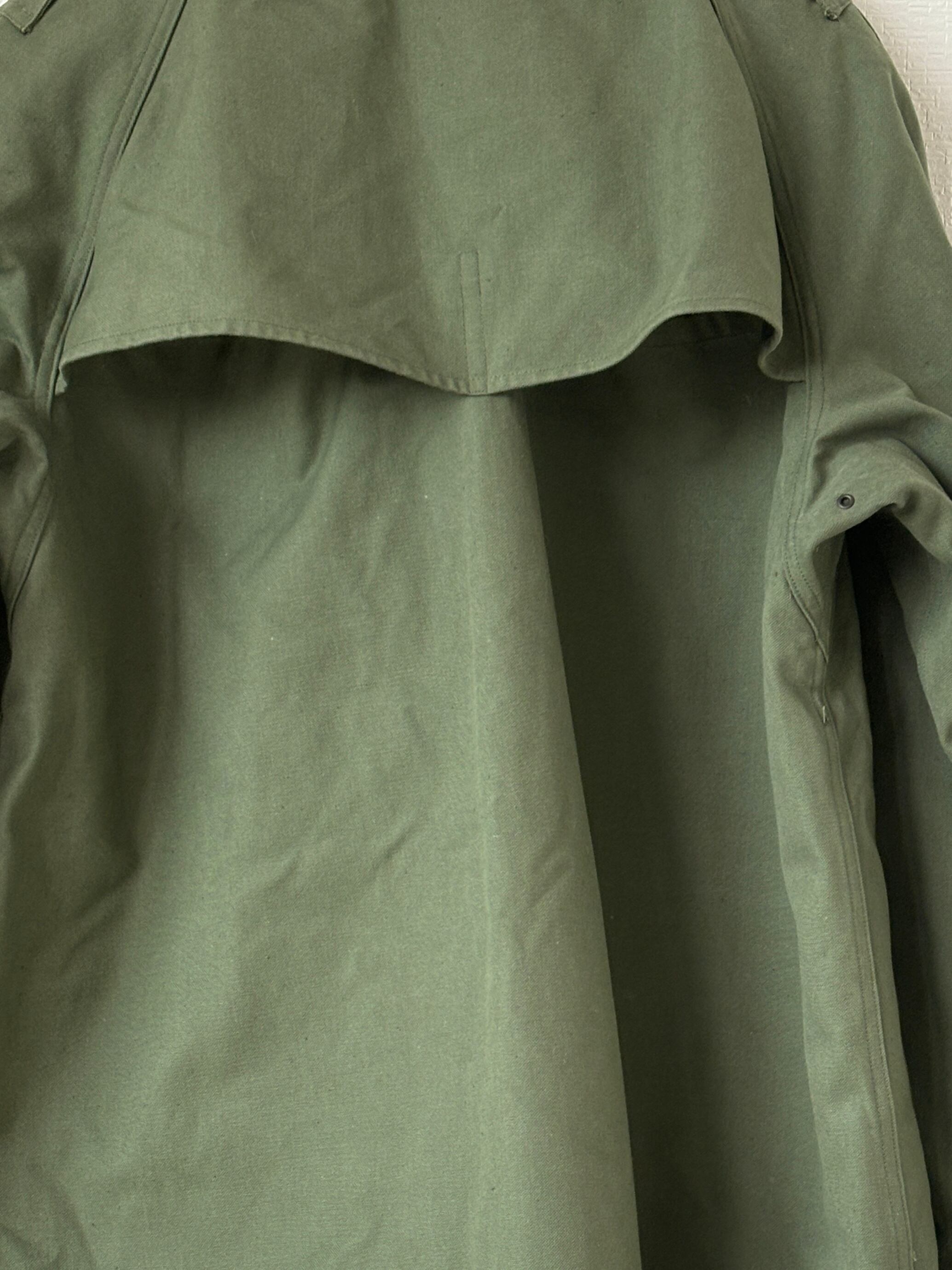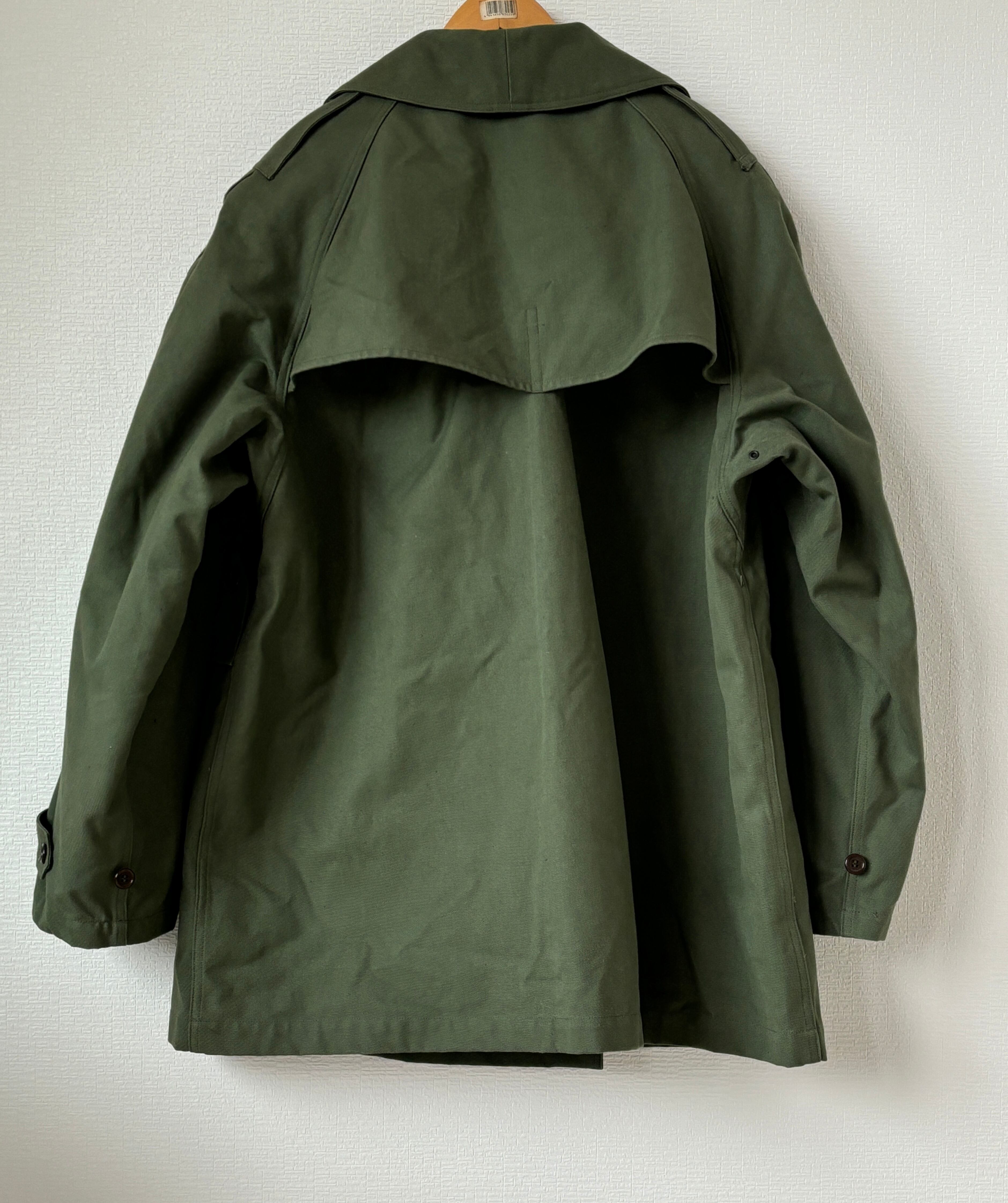 後期型の色はやや濃いめのオリーブグリーン ボタンは尿素ボタンで、サイズやメーカータグ、白地のネームタグなどが縫い付けられているといった仕様です