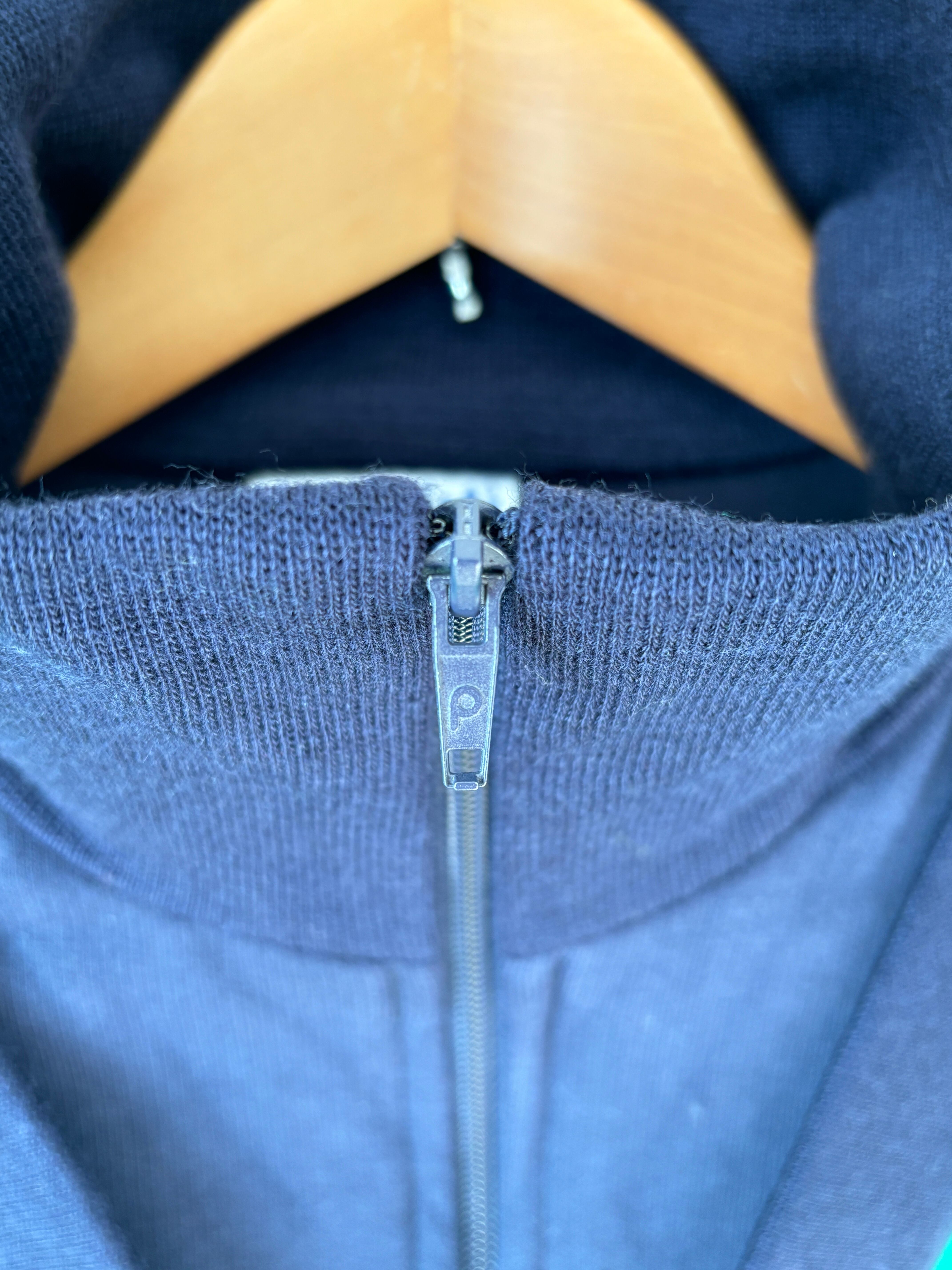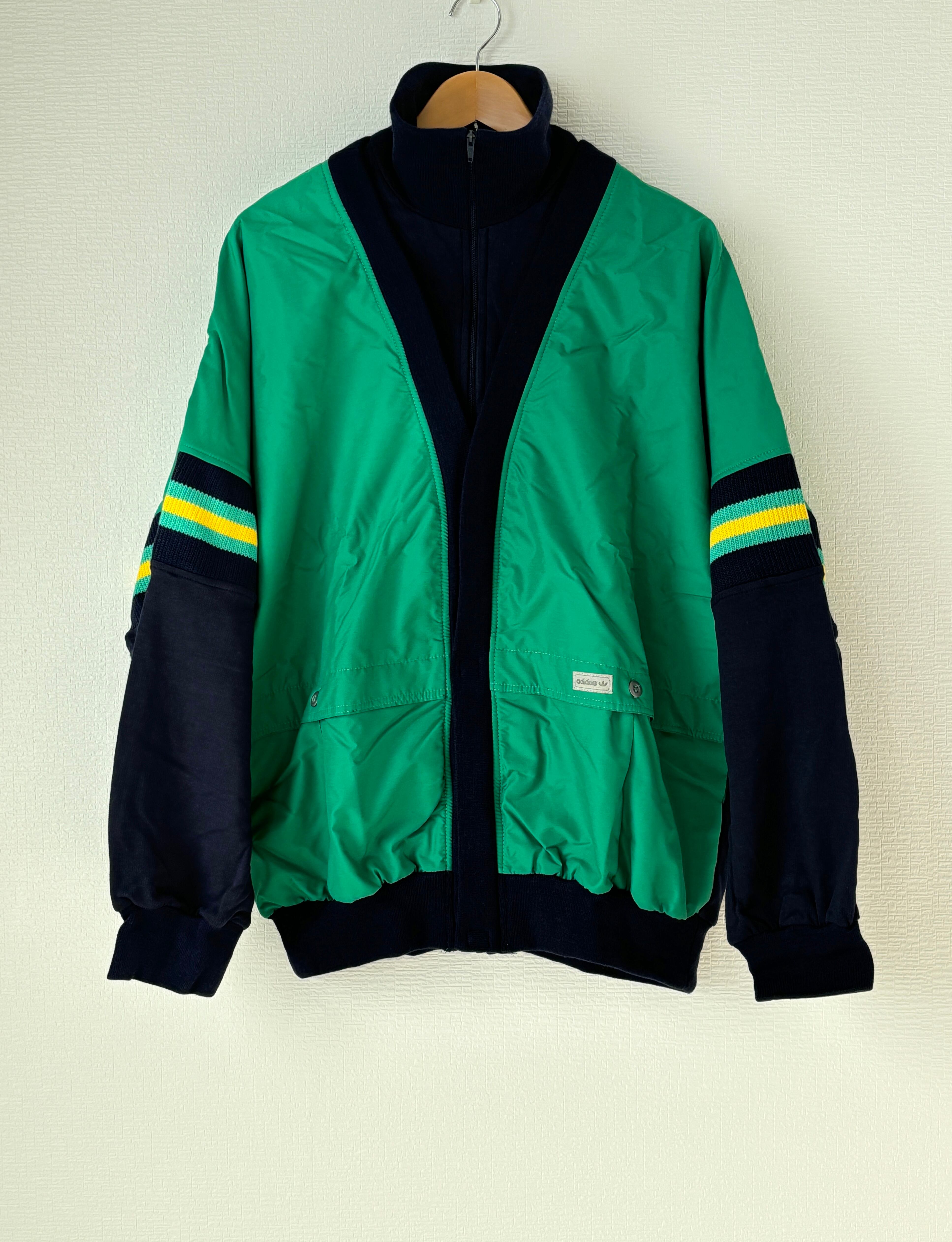 トラックジャケットの上にカーディガンを重ねたような、面白いデザインの1着。