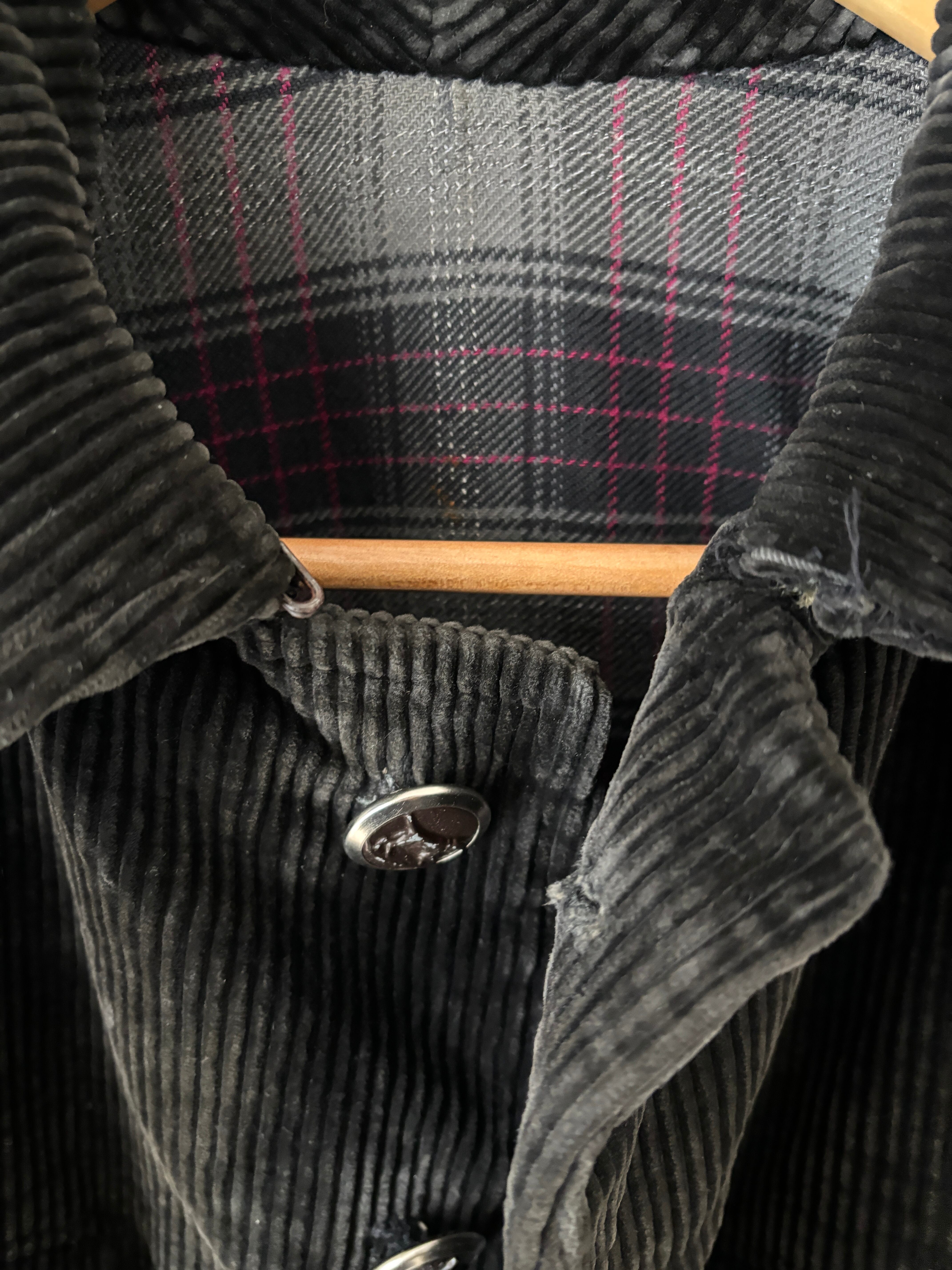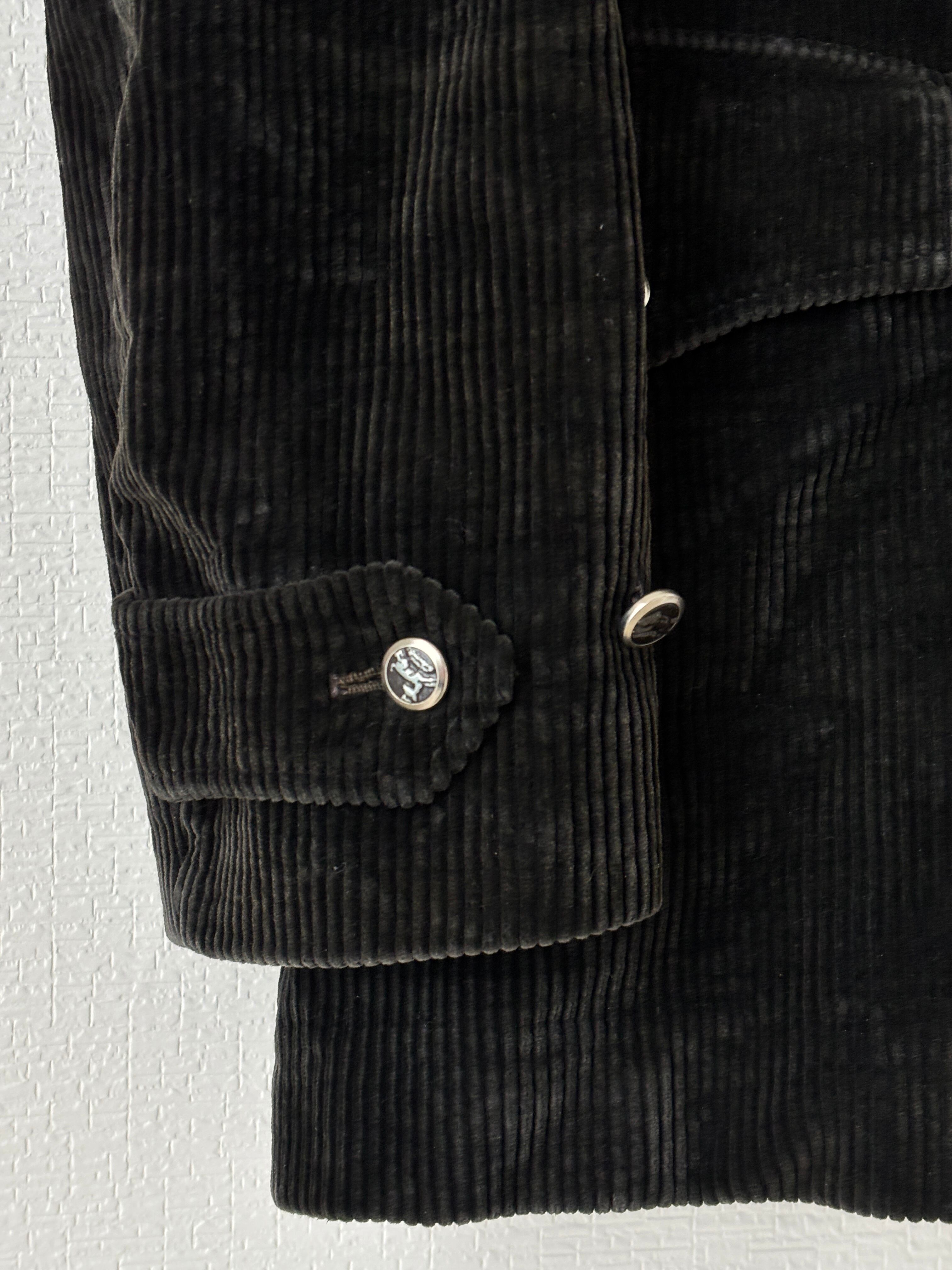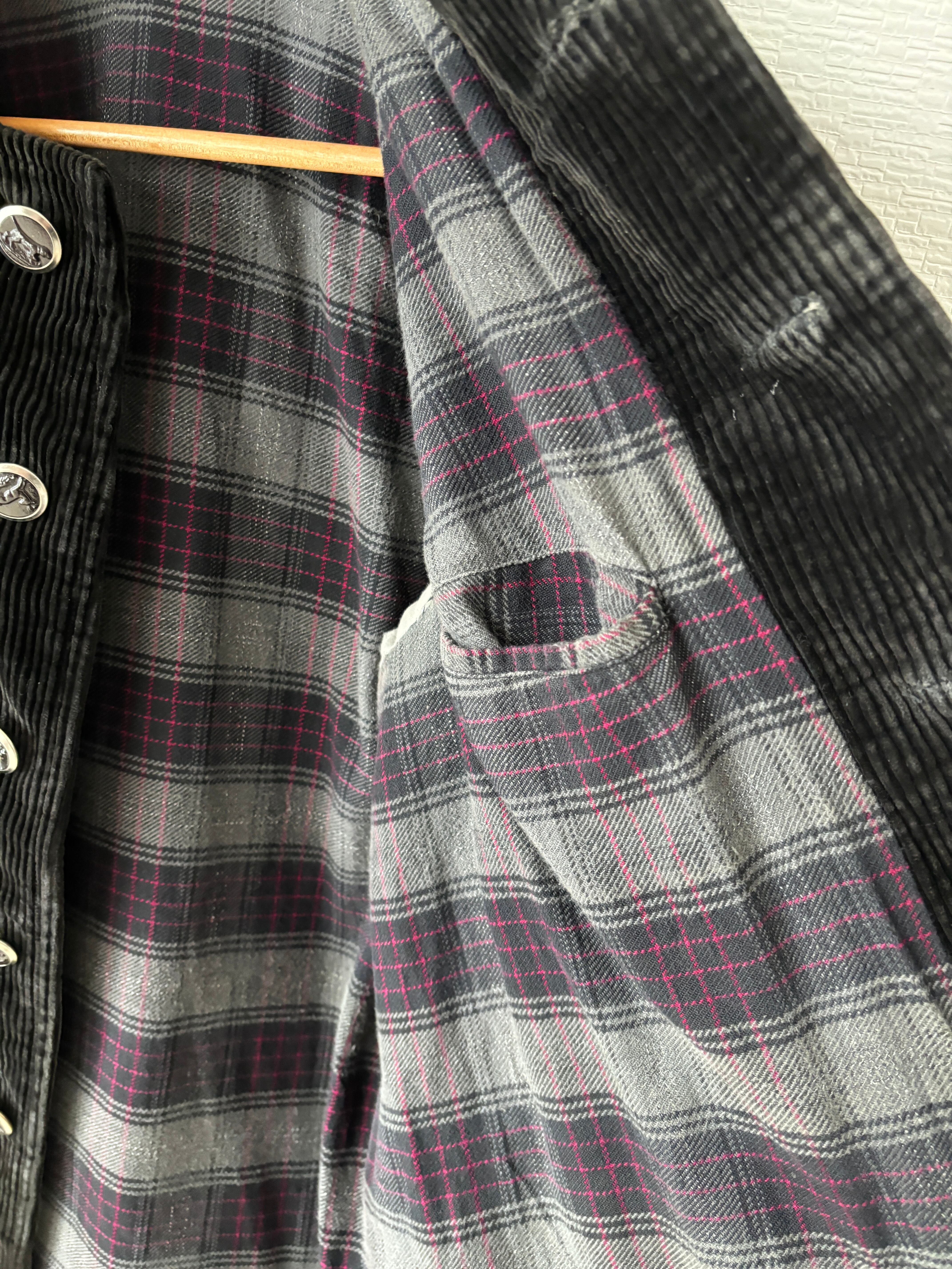 表地は厚手のしっかりした質感のコーデュロイ生地。フック留め仕様の丸みのある襟で、前面に4つポケット、背面にゲームポケットのあるクラシカルな形です。裏地のチェック柄の生地も素晴らしく、着心地もよいと思います。