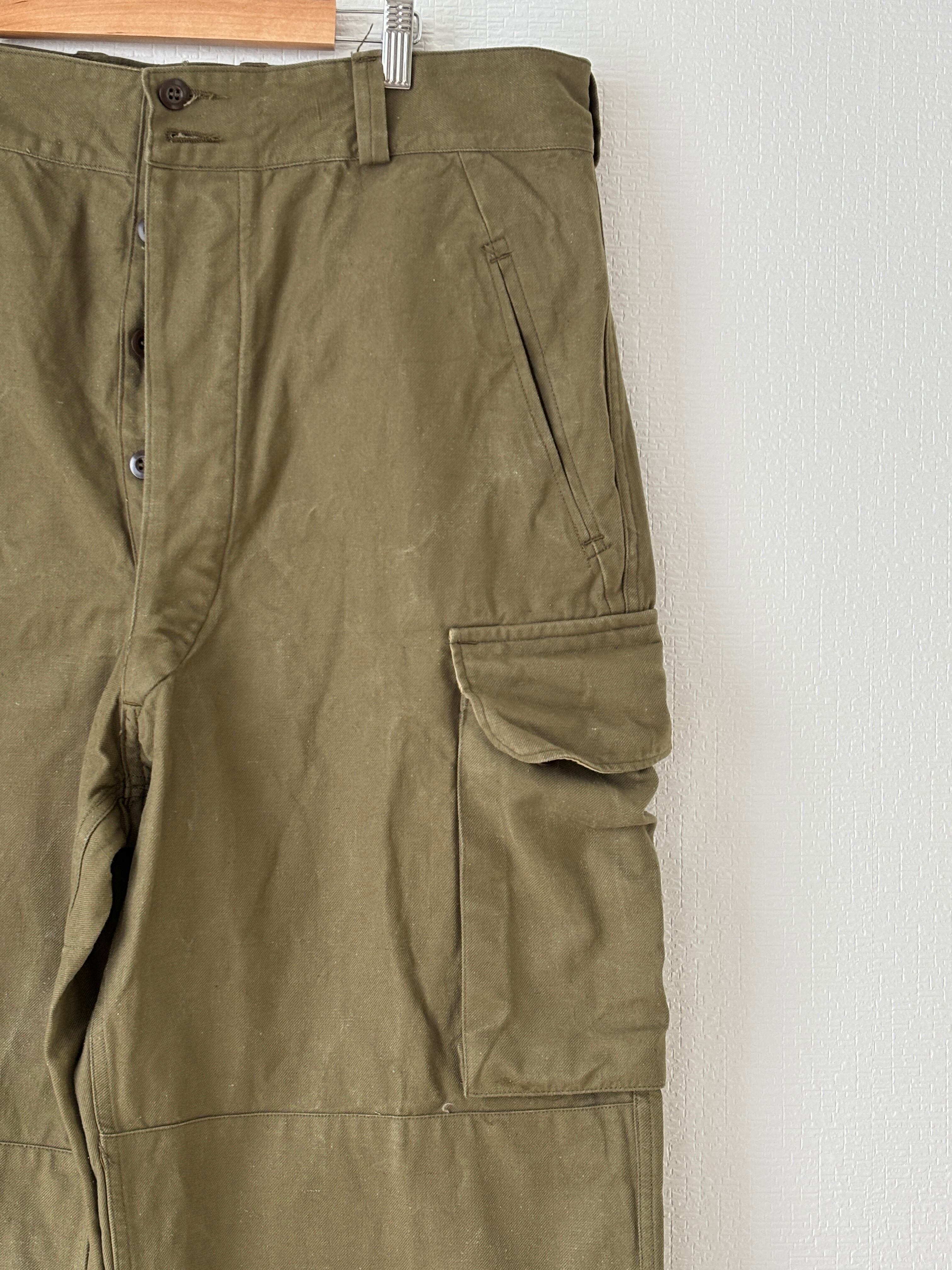 シルエットは太めのストレートで、両サイドには大きなフラップポケット、フラップを留めるボタン、裾のベルトなど、フレンチミリタリーの縫製の良さをこれでもかと感じることができると思います。