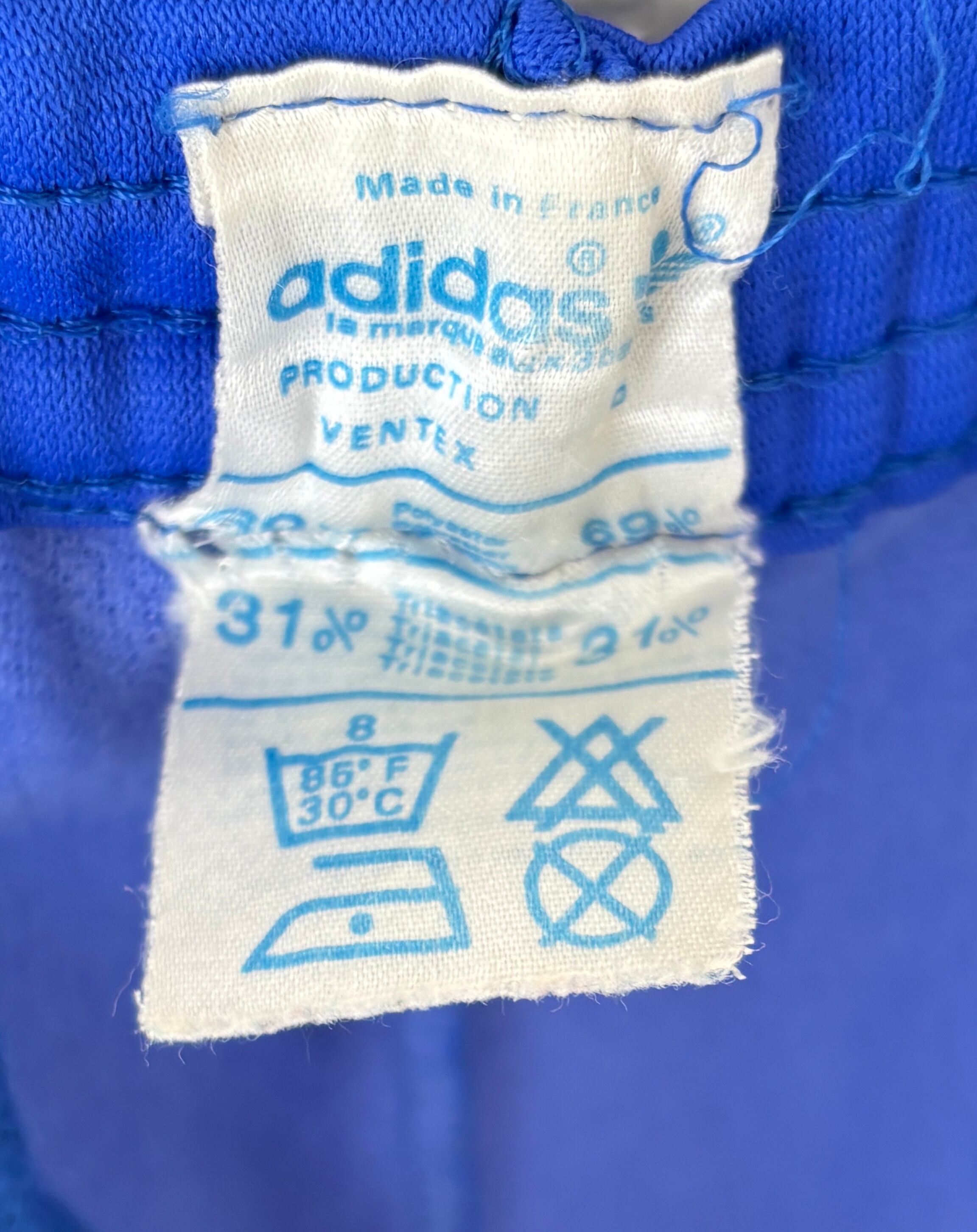1972年から1995年までアディダスの正式ロゴとして使用されていた、トレフォイルロゴのトラックパンツ。フランスVENTEX社製の1着です。